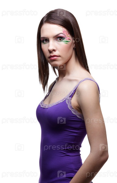 Портрет девушки с элементами боди-арта на виске, на белом фоне
