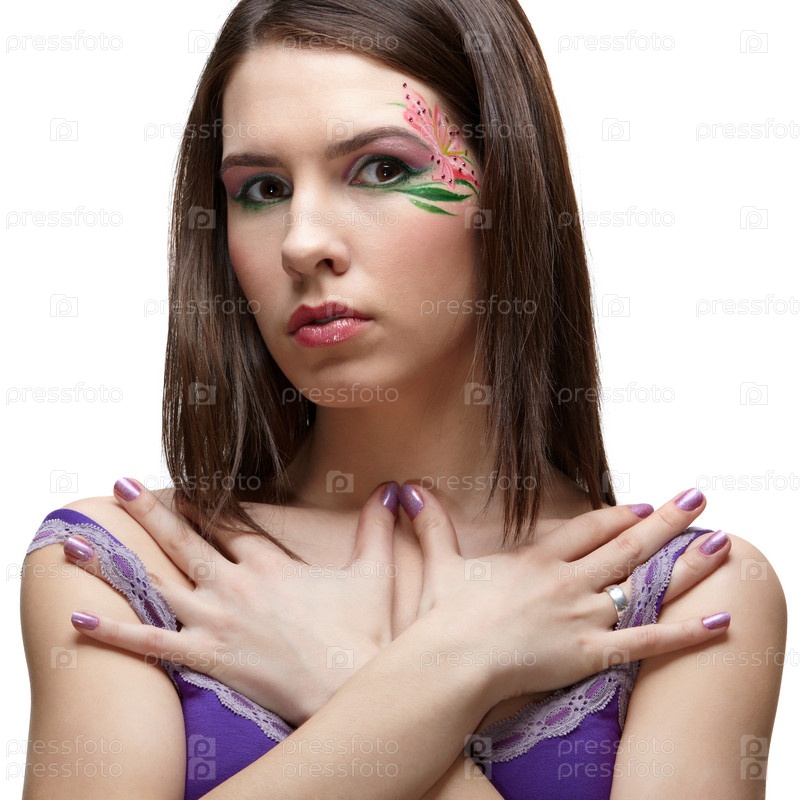 Портрет девушки с элементами боди-арта на виске, на белом фоне