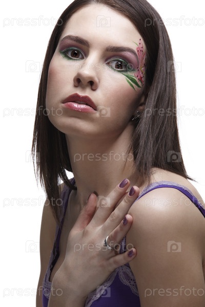 Портрет девушки с элементами боди-арта на виске, на белом фоне