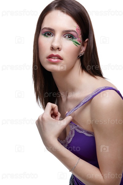 Портрет девушки с элементами боди-арта на виске, на белом фоне