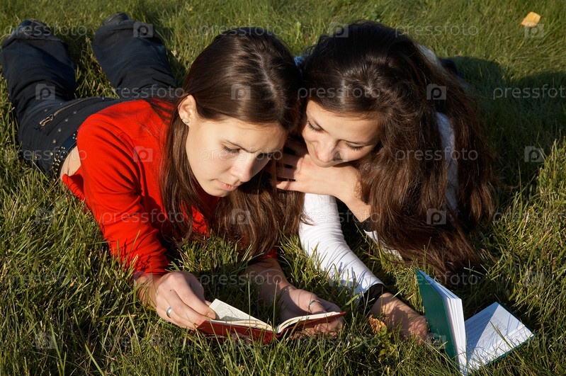 2 студентки читают книги, лежа на траве