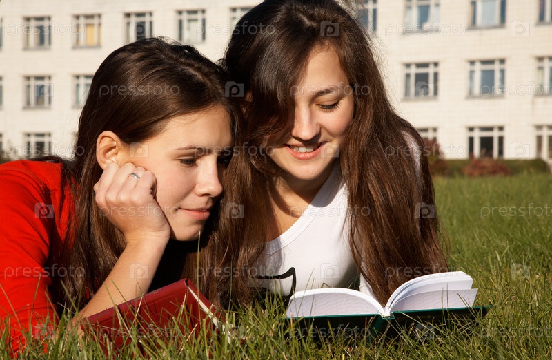 2 студентки читают книги, лежа на траве