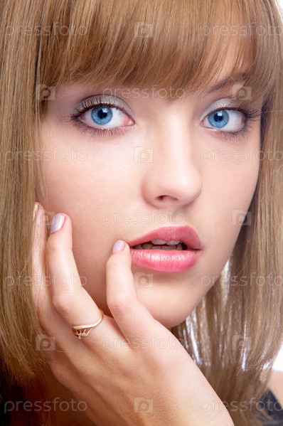 Портрет красивой светловолосой девушки с рукой у лица на белом фоне