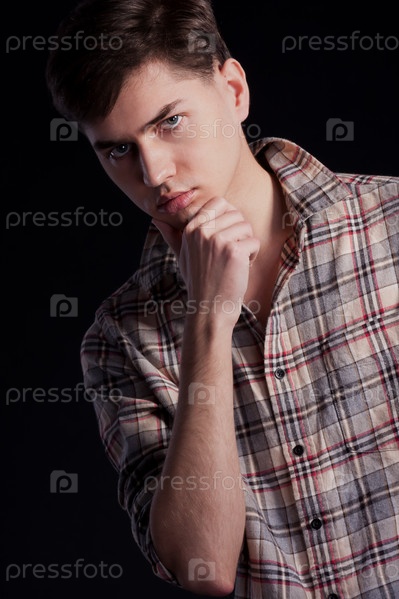 Портрет серьезного юноши в клетчатой рубашке на черном фоне