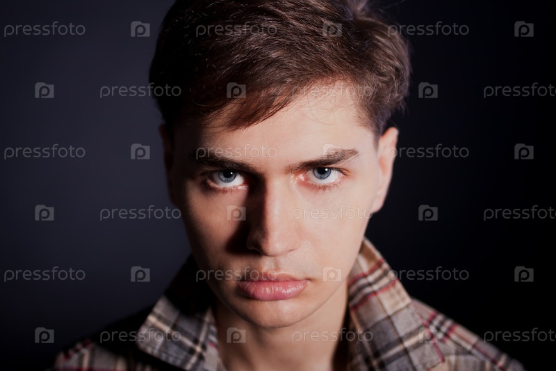 Портрет серьезного юноши в клетчатой рубашке на черном фоне