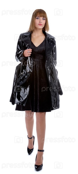 Девушка в лакированной куртке с сумочкой на длинной цепочке