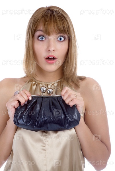 Удивленная девушка в золотистом платье с сумочкой на белом фоне