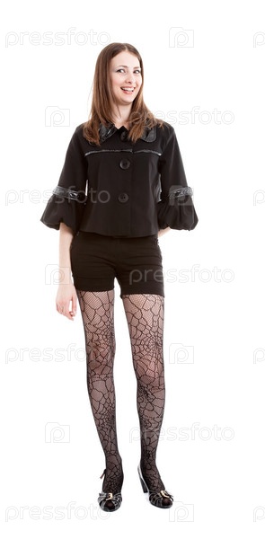 Молодая девушка в чулках-паутинках и в черном жакете позирует на белом фоне