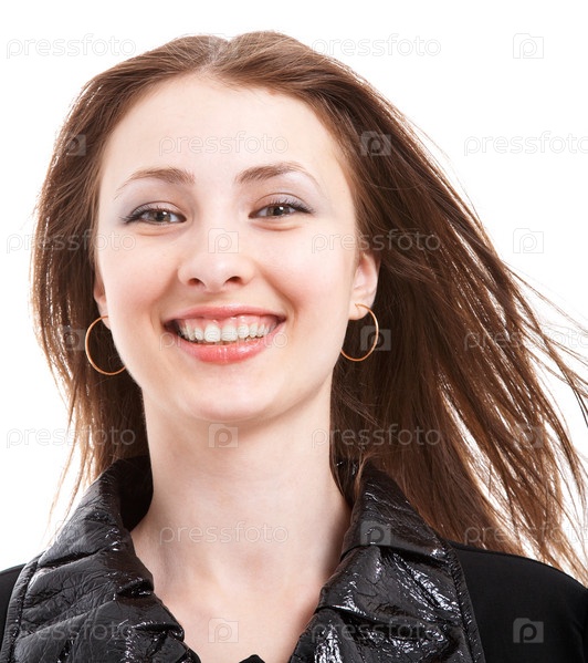 Счастливая молодая девушка в пиджаке на белом фоне