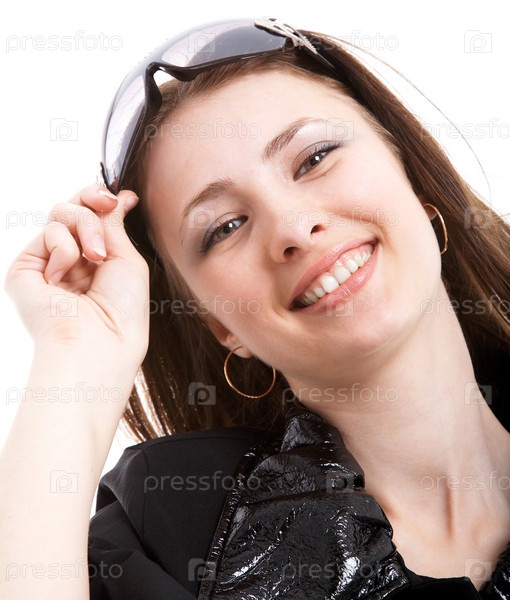 Счастливая молодая девушка в пиджаке с солнцезащитными очками в руке на белом фоне