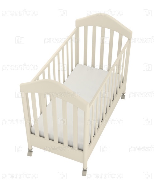 Белая детская кроватка на белом фоне
