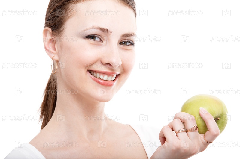 Молодая женщина - брюнетка с зеленым яблоком на белом фоне