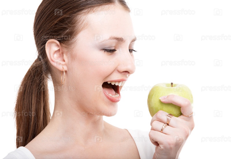 Молодая женщина - брюнетка с зеленым яблоком на белом фоне