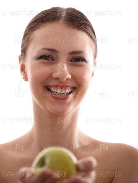 Молодая женщина - брюнетка с зеленым яблоком на белом фоне