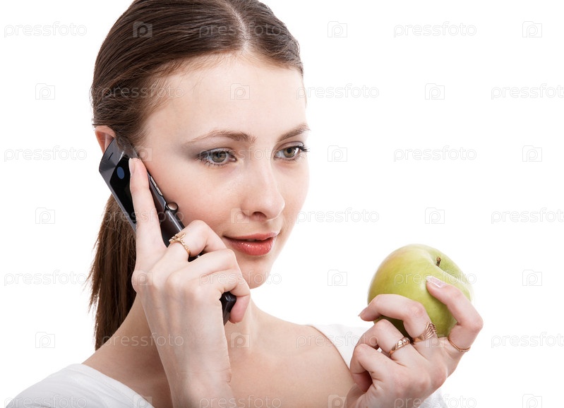 Молодая женщина - брюнетка с зеленым яблоком и телефоном на белом фоне