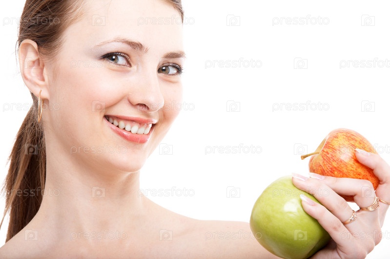 Девушка - брюнетка с двумя яблоками на белом фоне