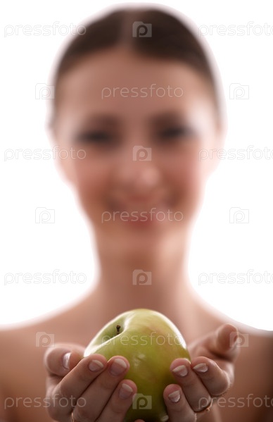 Девушка - брюнетка с зеленым яблоком на белом фоне