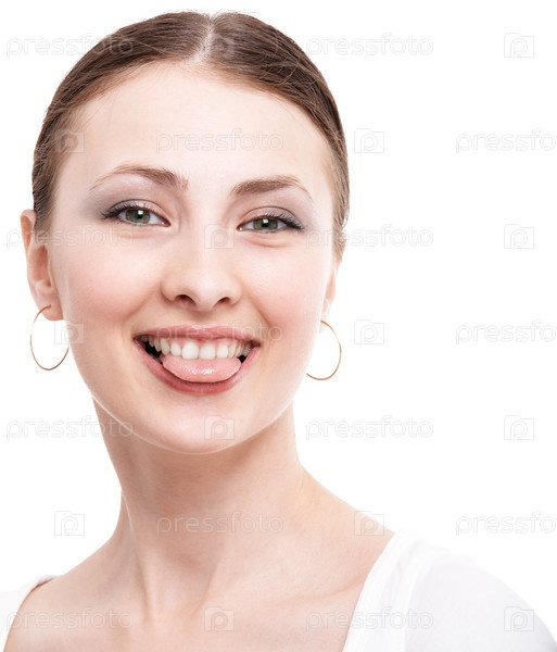 Веселая девушка- брюнетка показывает язык и дразнится