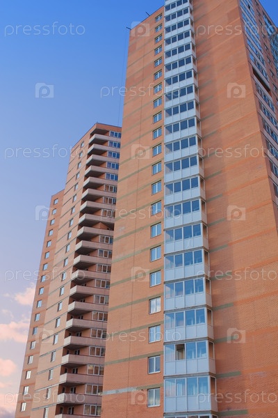 Жилой, кирпичный, многоэтажный дом на фоне неба