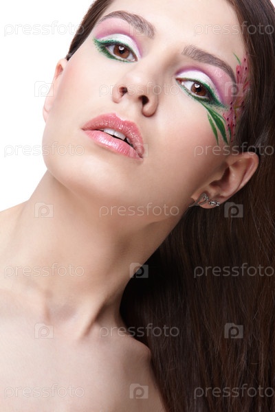 Портрет девушки с элементами боди-арта на виске, на белом фоне