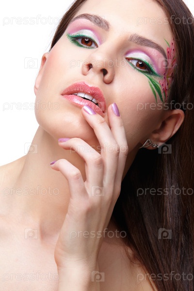 Портрет девушки с элементами боди-арта на виске, на белом фоне