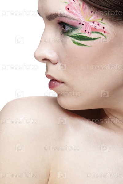 Портрет девушки с элементами боди-арта на виске, на белом фоне