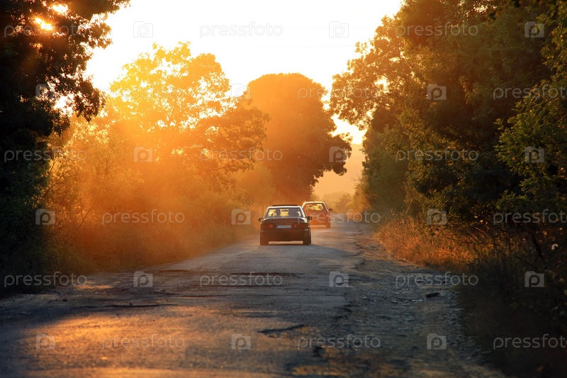 Автомобили на дороге на закате