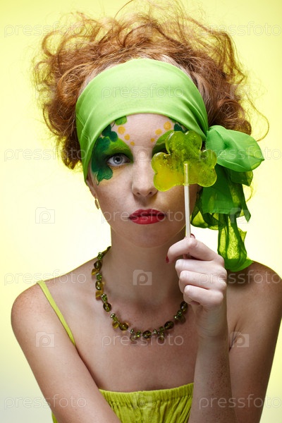 Портрет красивой рыжеволосой модели с Боди Артом и леденцом
