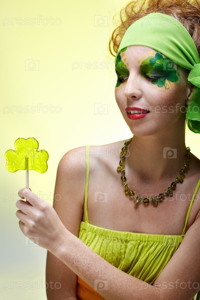 Портрет красивой рыжеволосой модели с Боди Артом и леденцом