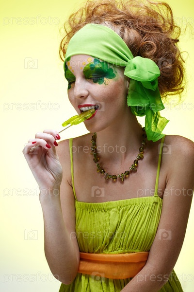 Портрет красивой рыжеволосой модели с Боди Артом и леденцом