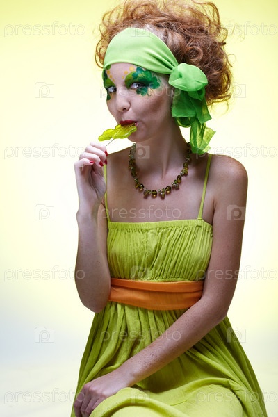 Портрет красивой рыжеволосой модели с Боди Артом и леденцом