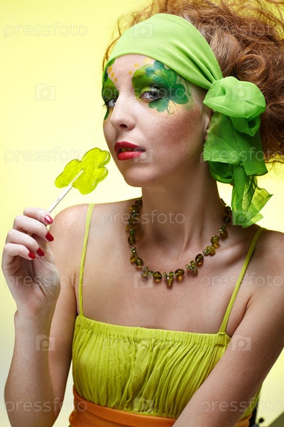 Портрет красивой рыжеволосой модели с Боди Артом и леденцом