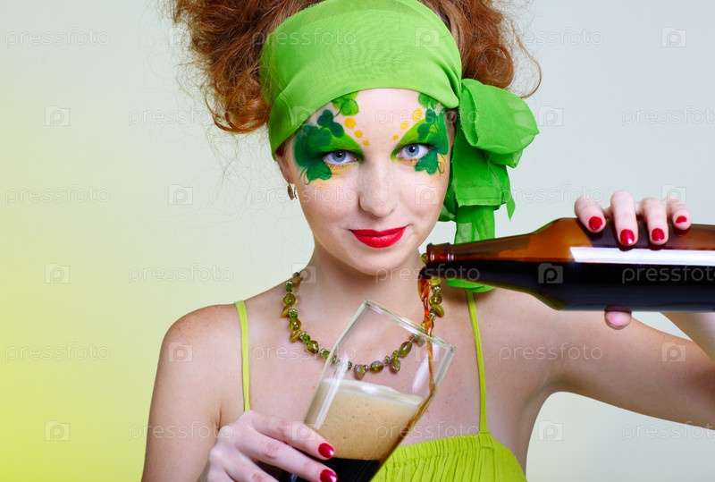 Красивая рыжеволосая модель с Шемрок Боди Арт наливает из бутылки