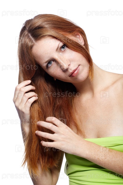 Портрет красивой рыжеволосой модели на белом фоне