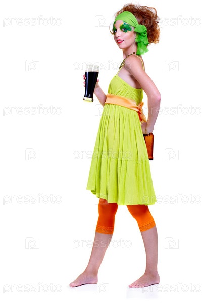 Красивая рыжеволосая модель с Шемрок Боди Арт и со стаканом пива