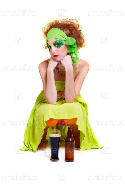 Красивая рыжеволосая модель с Шемрок Боди Арт с бутылкой и стаканом