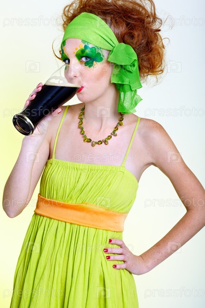Красивая рыжеволосая модель с Шемрок Боди Арт пьет пиво