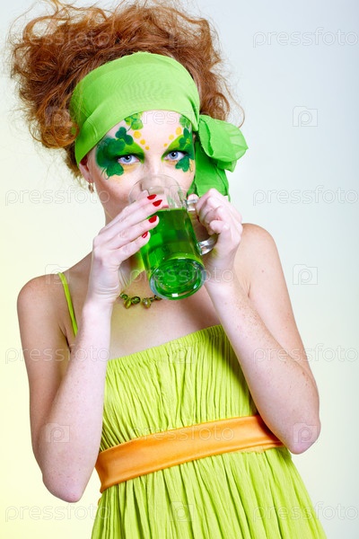 Красивая рыжеволосая модель с Шемрок Боди Арт пьет зеленое пиво