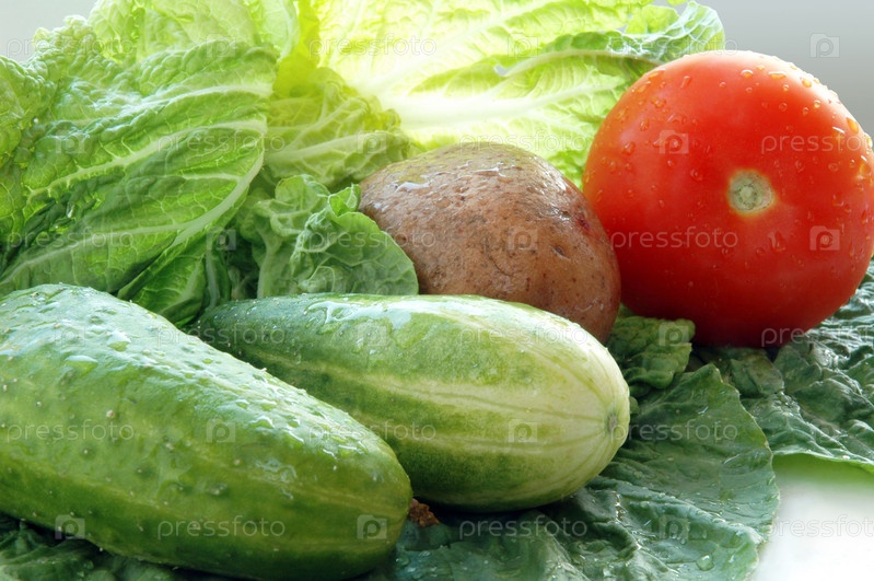 Помидор, картофель и огурцы на салатных листьях