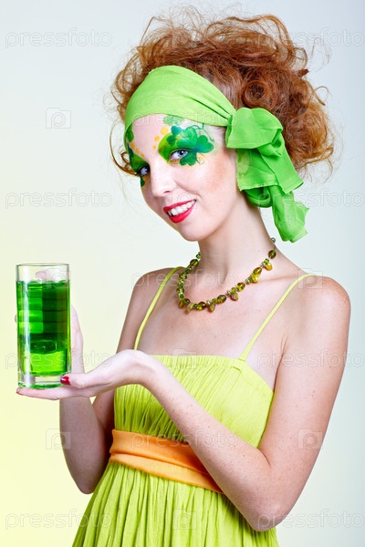 Красивая рыжеволосая модель с Шемрок Боди Арт со стаканом зеленого пива