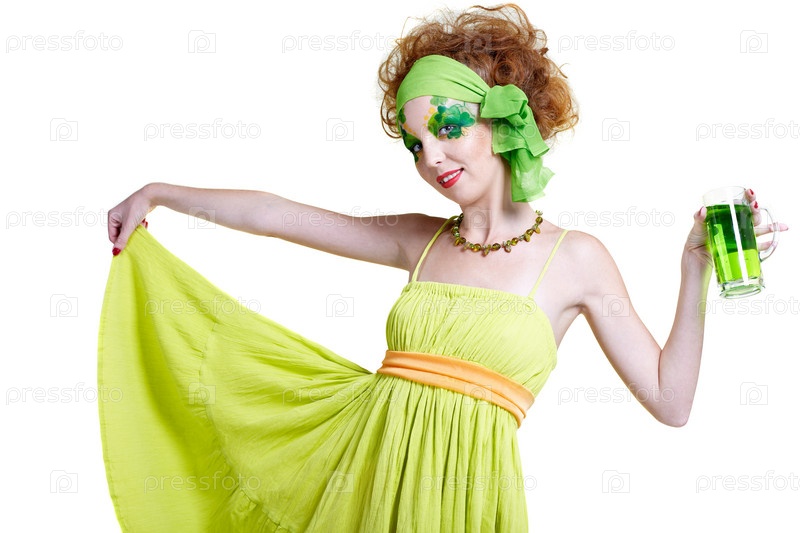 Красивая рыжеволосая модель с Шемрок Боди Арт со стаканом зеленого пива