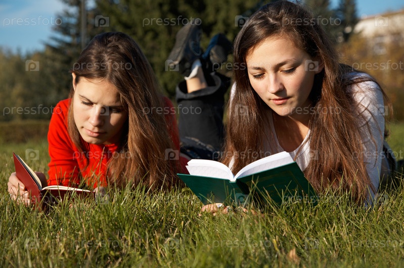 Студентки читают книги на лужайке