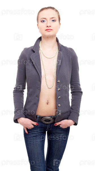 Молодая красивая девушка в сером пиджаке на белом фоне