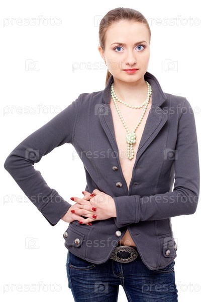 Молодая красивая девушка в сером пиджаке на белом фоне