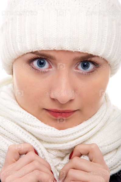Портрет молодой красивой девушки в белой зимней шапке и шарфе