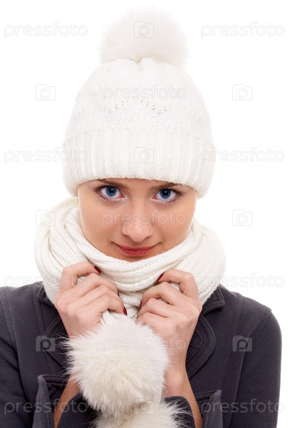 Портрет молодой красивой девушки в белой зимней шапке и шарфе