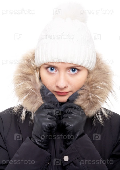 Портрет молодой красивой девушки в белой зимней шапке и шарфе