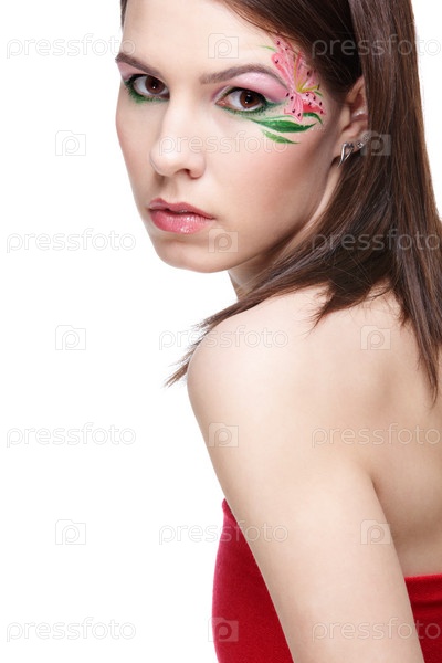 Портрет девушки с элементами боди-арта на виске, на белом фоне