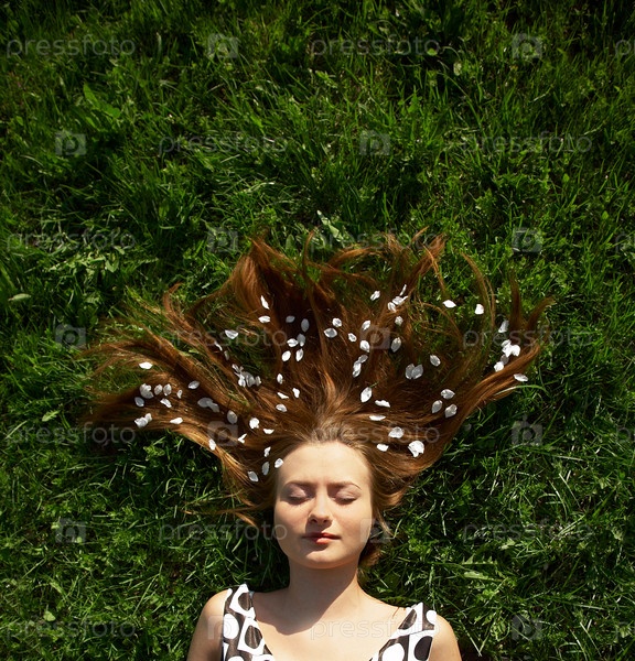 Девушка лежит на траве с лепестками в волосах