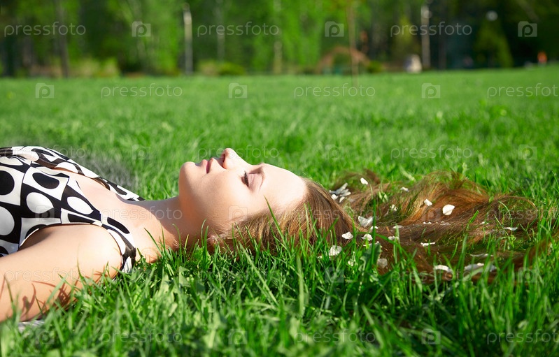 Девушка лежит на траве с лепестками в волосах